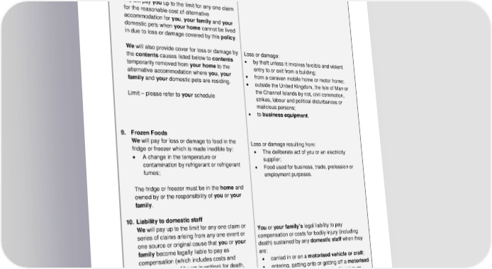 ADH 15.04a 11 7. Contents in the garden We will pay you up to the limit for any one claim for loss or damage by the causes outlined below to contents (including plants, bushes, shrubs and trees) when in the open within the boundaries of the land belonging to the home. 8. Alternative accommodation We will pay you up to the limit for any one claim for the reasonable cost of alternative accommodation for you, your family and your domestic pets when your home cannot be lived in due to loss or damage covered by this policy . We will also provide cover for loss or damage by the contents causes listed below to contents temporarily removed from your home to the alternative accommodation where you, your family and your domestic pets are residing. Limit – please refer to your schedule 9. Frozen Foods We will pay for loss or damage to food in the fridge or freezer which is made inedible by: • A change in the temperature or contamination by refrigerant or refrigerant fumes; The fridge or freezer must be in the home and owned by or the responsibility of you or your family . 10. Liability to domestic staff We will pay up to the limit for any one claim or series of claims arising from any one event or one source or original cause that you or your family become legally liable to pay as compensation ( which includes costs and expenses agreed by us in writing) for death, bodily injury or illness of any domestic staff within the United Kingdom. Limit – please refer to your schedule Loss or damage: • to valuables, money, business equipment and bicycles; • while the home is unoccupied or unfurnished. Loss or damage: • by theft unless it involves forcible and violent entry to or exit from a building; • from a caravan mobile home or motor home; • outside the United Kingdom, the Isle of Man or the Channel Islands by riot, civil commotion, strikes, labour and political disturbances or malicious persons; • to business equipment. Loss or damage resulting from: • The deliberate act of you or an electricity supplier; • Food used for business, trade, profession or employment purposes. You or your family’s legal liability to pay compensation or costs for bodily injury (including death) sustained by any domestic staff when they are: • carried in or on a motorised vehicle or craft; • entering, getting onto or getting off a motorised vehicle or craft where such bodily injury or illness (including death) is caused by or arises out of you or your family’s use of a motorised vehicle or craft .
