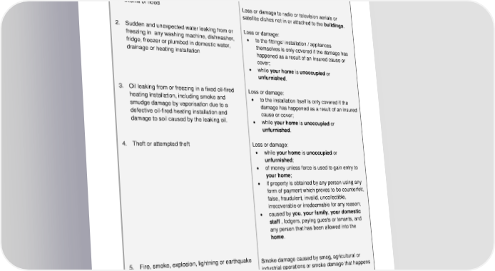 ADH 15.04a 15 Causes What your policy covers: What your policy does not cover: Your policy covers contents whilst in the home for loss or damage resulting from the following causes: 1. Storm or flood 2. Sudden and unexpected water leaking from or freezing in any washing machine, dishwasher, fridge, freezer or plumbed in domestic water , drainage or heating installation 3. Oil leaking from or freezing in a fixed oil -fired heating installation, including smoke and smudge damage by vaporisation due to a defective oil -fired heating installation and damage to soil caused by the leaking oil. 4. Theft or attempted theft 5. Fire, smoke, explosion, lightning or earthquake Loss or damage to radio or television aerials or satellite dishes not in or attached to the b uildings. Loss or damage: • to the fittings/ installation / appliances themselves is only covered if the damage has happened as a result of an insured cause or cover; • while your home is unoccupied or unfurnished . Loss or damage: • to the installation itself is only covered if the damage has happened as a result of an insured cause or cover; • while your home is unoccupied or unfurnished . Loss or damage: • while your home is unoccupied or unfurnished ; • of money unless force is used to gain entry to your home ; • if property is obtained by any person using any form of payment which proves to be counterfeit, false, fraudulent, invalid, uncollectible, irrecoverable or irredeemable for any reason; • caused by you, your family , your domestic staff , lodgers, paying guests or tenants, and any person that has been allowed into the home . Smoke damage caused by smog, agricultural or industrial operations or smoke damage that happens gradually from repeated exposure.