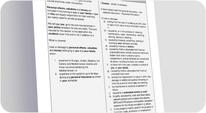 ADH 15.04a 17 Personal Possessions (optional extra) Your policy schedule will show if you have chosen this section. What your policy covers: What your policy does not cover: Your p olicy schedule will show you the sums insured and limits under this s ection. Personal effects, valuables and money are included if they belong to you or your family or you or they are legally responsible for them and they are mainly used for private purposes. We will pay you up to the sum insured shown in your p olicy schedule for any one claim. The sum insured for this section is included within the c ontents cover limit and is not in addition to it. What is covered Loss or damage to personal effects, valuables and money belonging to you and your family when: 1. anywhere in Europe, Jordan, Madeira, the Canary and Mediterranean islands and those countries bordering the Mediterranean; or 2. anywhere in the world for up to 60 days during any period of insurance as shown in your schedule. 1. Excess – shown in schedule. 2. Items listed under the g eneral exclusions – see separate document – Essential Information. 3. Loss or damage: a) arising from the cost of remaking any film, disc or tape or the value of any information held on it. b) caused by, or in the process of, cleaning, maintenance, repair, dismantling, restoring, altering, dyeing or washing. c) caused by chewing, scratching, tearing or fouling by your domestic animals. d) caused by insects or vermin. e) caused by theft or attempted theft from an unattended motor vehicle unless the items are hidden from view in a boot or glove compartment , and all windows are closed and all doors, including the boot, are locked. f) to items not in the care, custody or control of you, or your family . g) caused by theft or attempted theft from an unlocked hotel room. h) arising from depreciation in value or other loss, damage or additional expense following on from the event for which you are claiming. i) by mechanical or electrical breakdown or failure. j) caused to a motorised vehicle or craft. k) to parts, accessories, tools and fitted radios, cassette players and compact disc players, MP3 and DVD players and satellite navigation systems for the things excluded in (j) above. l) to any property mainl y used for the purpose of business, trade, profession or employment. m) to plants or any living creature. n) to documents. o) where property is obtained by any person using any form of payment which proves to be counterfeit, false, fraudulent, invalid, uncollectibl e, irrecoverable or irredeemable. p) specifically covered elsewhere in this p olicy.