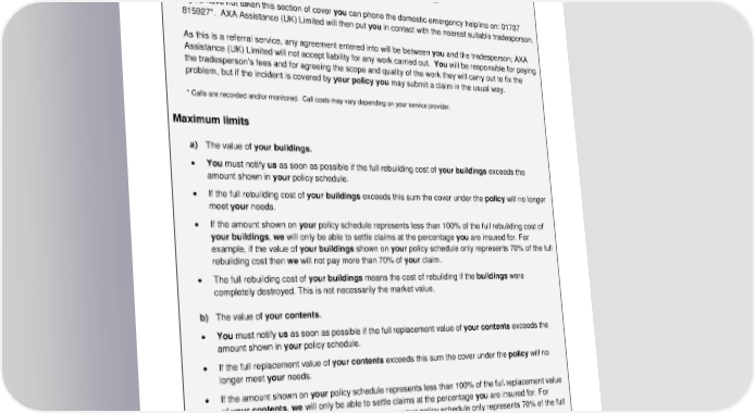 ADH 15.04a 20 * Calls are recorded and/or monitored. Call costs may vary depending on your service provider. Domestic Helpline If you have chosen home assistance cover, then you may be covered for certain home emergency costs. You should call the home assistance emergency helpline on: 0844 874 0221* If you have not taken this section of cover you can phone the domestic emergency helpline on: 01737 815927*. AXA Assistance (UK) Limited will then put you in contact with the nearest suitable tradesperson. As this is a referral service, any agreement entered into will be between you and the tradesperson; AXA Assistance (UK) Limited will not accept liability for any work carried out. You will be responsible for paying the tradesperson ’s fees and for agreeing the scope and quality of the work they will carry out to fix the problem, but if the incident is covered by your policy you may submit a claim in the usual way. * Calls are recorded and/or monitored. Call costs may vary depending on your service provider. Maximum limits a) The value of your buildings . • You must notify us as soon as possible if the full rebuilding cost of your buildings exceeds the amount shown in your policy schedule. • If the full rebuilding cost of your buildings exceeds this sum the cover under the policy will no longer meet your needs. • If the amount shown on your policy schedule represents less than 100% of the full rebuilding cost of your buildi ngs, we will only be able to settle claims at the percentage you are insured for . For example, if the value of your buildings shown on your policy schedule only represents 70% of the full rebuilding cost then we will not pay more than 70% of your claim. • The full rebuilding cost of your buildings means the cost of rebuilding if the buildings were completely destroyed. This is not necessarily the market value. b) The value of your contents. • You must notify us as soon as possible if the full replacement value of your c ontents exceeds the amount shown in your policy schedule. • If the full replacement value of your c ontents exceeds this sum the cover under the p olicy will no longer meet your needs. • If the amount s hown on your policy schedule represents less than 100% of the full replacement value of your contents , we will only be able to settle claims at the percentage you are insured for . For example, if the value of your contents shown on your policy schedule onl y represents 70% of the full replacement cost then we will not pay more than 70% of your claim. • The full replacement value of your c ontents means the current cost as new.