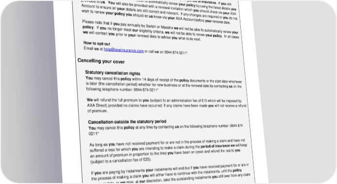 ADH 15.04a 22 Automatic Renewals By purchasing this policy you have provided consent to set up a continuous payment authority. This means we are authorised to automatically renew your policy and apply for renewal payments from your account every year , even if your card has expired, until you instruct us to stop . We will contact you in writing at least 21 days before the end of your period of insurance. If you still meet our eligibility criteria, we will seek to automatically renew your policy by using the latest details you provided to us. You will also be provided with a renewal invitation which you should check via your AXA Account to ensure all your details are still correct and relevant. If any changes are required or you do not wish to renew your policy you should let us know via your AXA Account before your renewal date. Please note that if you pay annually by Switch or Maestro we will not be able to automatically renew your policy. If you no longer meet our eligibility criteria, we will not be able to renew your policy . In all cases we will contact you prior to your renewal date to advise you what to do next. How to opt-out Email us at help@axainsurance.com or call us on 0844 874 0211* Cancelling your cover Statutory cancellation rights You may cancel this policy within 14 days of receipt of the policy documents or the start date whichever is later (the cancellation period) whether for new business or at the renewal date by contacting us on the following telephone number: 0844 874 0211* We will refund the full premium to you (subject to an administration fee of £15 which will be imposed by AXA Direct) provided no claims have occurred. If any claims have been made you will not receive a refund of premium. Cancellation outside the statutory period You may cancel this policy at any time by contacting us on the following telephone number: 0844 874 0211* As long as you have not received payment for or are not in the process of making a claim and have not suffered a loss for which you are intending to make a claim during the period of insurance we will keep an amount of premium in proportion to the time you have been on cover and refund the rest to you (subject to a cancellation fee of £25). If you are paying by instalments your instalments will end but if you have received payment for or are in the process of making a claim you will either have to continue with the instalments, until the policy renewal date, or we may, at our discretion, take the outstanding instalments you still owe from any claim payment we make. If you pay annually and you have received payment for or are in the process of making a claim you will not receive any refund of premium. * Calls are recorded and monitored. Call costs may vary depending on your service provider.