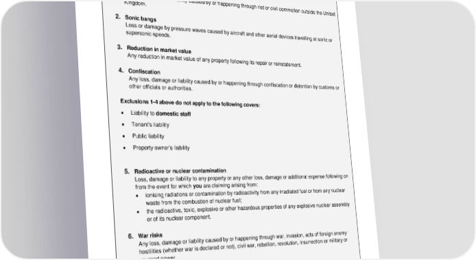 ADH 15.04a 24 General Exclusions These exclusions apply throughout your p olicy . We will not pay for: 1. Riot/or civil commotion Any loss, damage or liability caused by or happening through riot or civil commotion outside the United Kingdom. 2. Sonic bangs Loss or damage by pressure waves caused by aircraft and other aerial devices travelling at sonic or supersonic speeds. 3. Reduction in market value Any reduction in market value of any property following its repair or reinstatement. 4. Confiscation Any loss, damage or liability caused by or happening through confiscation or det ention by customs or other officials or authorities. Exclusions 1-4 above do not apply to the following covers: • Liability to domestic staff • Tenant’s liability • Public liability • Property owner’s liability 5. Radioactive or nuclear contamination Loss, damage or liability to any property or any other loss, damage or additional expense following on from the event for which you are claiming arising from: • ionising radiations or contamination by radioactivity from any irradiated fuel or from any nuclear waste from the combustion of nuclear fuel; • the radioactive, toxic, explosive or other hazardous properties of any explosive nuclear assembly or of its nuclear component. 6. War risks Any loss, damage or liability caused by or happening through war, invasion, acts of foreign enemy hostilities (whether war is declared or not), civil war, rebellion, revolution, insurrection or military or usurped power.