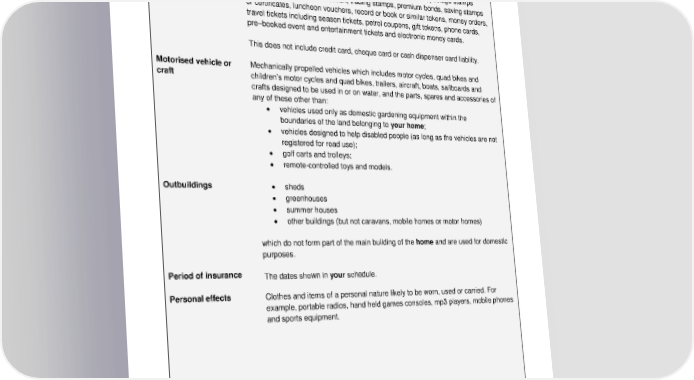 ADH 15.04a 27 Home The private residence shown in your policy schedule including its garages and outbuildings if they form part of the property. Landslip Sudden movement of soil on a slope or gradual creep of a slope over a period of time other than settlement . Money Coins and bank notes in current use, cheques, postal orders, postage stamps which are not part of a collection, trading stamps, premium bonds, saving stamps or certificates, luncheon vouchers, record or book or similar tokens, money orders, travel tickets including season tickets, petrol coupons, gift tokens, phone cards, pre– booked event and entertainment tickets and electronic money cards. This does not include credit card, cheque card or cash dispenser card liability. Motorised vehicle or craft Mechanically propelled vehicles which includes motor cycles, quad bikes and children’s motor cycles and quad bikes, trailers, aircraft, boats, sailboards and crafts designed to be used in or on water, and the parts, spares and accessories of any of these other than: • vehicles used only as domestic gardening equipment within the boundaries of the land belonging to your home ; • vehicles designed to help disabled people (as long as the vehicles are not registered for road use); • golf carts and trolleys; • remote- controlled toys and models. Outbuildings Period of insurance • sheds • greenhouses • summer houses • other buildings (but not caravans, mobile homes or motor homes) which do not form part of the main building of the home and are used for domestic purposes. The dates shown in your schedule. Personal effects Clothes and items of a personal nature likely to be worn, used or carried. For example, portable radios, hand held games consoles, mp3 players, mobile phones and sports equipment.