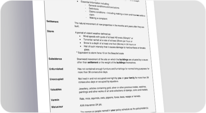 ADH 15.04a 28 Policy The policy describes the insurance cover provided during the period of insurance as shown in your schedule which you have paid for, or have agreed to pay for, and for which we have accepted the premium. Your policy is made up of the following components: • Schedule – identifying which sections of the policy you have bought • Section Wordings • Essential Information including: - General conditions and exclusions - Definitions - Claims conditions – including making a claim and how we settle a claim - Making a complaint Settlement The natural movement of new properties in the months and years after they are built. Storm A period of violent weather defined as: • Wind speeds with gusts of at least 48 knots (55mph)* or • Torrential rainfall at a rate of at least 25mm per hour or • Snow to a depth of at least one foot (30cms) in 24 hours or • Hail of such intensity that it causes damage to hard surfaces or breaks glass. * Equivalent to storm force 10 on the Beaufort scale Subsidence Downward movement of the site on which the buildings are situated by a cause other than settlement or the weight of the buildings themselves. Unfurnished Has not contained enough furniture and furnishings for normal living purposes for more than 30 consecutive days . Unoccupied Not lived in and not occupied overnight by you or your family for more than 30 consecutive days or occupied by squatters Valuables Jewellery, articles containing gold, silver or other precious metals, watches, paintings and other works of art and collections of stamps, coins and medals. Vermin Rats, mice, squirrels, owls, pigeons, foxes, bees, wasps or hornets. We/us/our AXA Insurance UK plc. You/your The person or people named in your policy schedule as the policyholder(s).