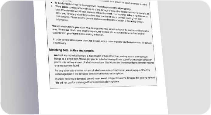 ADH 15.04a 32 Storm Damage claims The definition of what we mean by storm can be found in the ‘Definitions’ section. Whe n we assess your claim, we will not rely solely on the definition of storm as this is just one factor we consider when you have this kind of damage to your home. Other factors we consider are as follows: • Does the evidence show that storm conditions occurred on or around the date the damage is said to have happened. • Is the damage claimed for consistent with t he damage caused by storm damage. • Were storm conditions the main cause of the damage or were other factors involved. For example, we look if the damage would have occurred without the storm . This insurance policy is not designed to cover you for any gradual deterioration, wear and tear or loss or damage resulting from poor maintenance. Please see the general exclusions and conditions section of this policy for more information. We will always talk to you about what damage you have as well as look at the we ather conditions in the area. Where we obtain local weather reports, we will take into account the distance of any weather stations from your home before making a decision. In order to help assess your claim, we will also send a claims expert to your home to inspect the damage if necessary. Matching sets, suites and carpets We treat any individual items of a matching set or suite of furniture, sanitary ware or other bathroom fittings as a single item. We will pay you for individual damaged items but not for undamaged companion pieces unless they are part of a bathroom suite or fitted kitchen and the damaged parts cannot be repaired or a replacement found. For any other sets or suites not part of a bathroom suite or fi tted kitchen, we will pay up to 50% of the undamaged part if the damaged parts cannot be matched or replaced. If a floor covering is damaged beyond repair we will only pay to have the damaged floor covering replaced. We will not pay for undamaged floor cov ering in adjoining rooms.