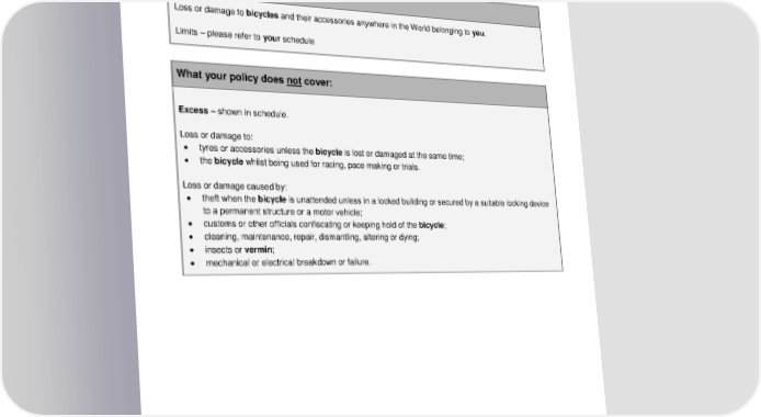 ADH 15.04a 36 Bicycles Cover (optional extra) Your policy schedule will show if you have chosen this section. What your policy covers: Loss or damage to bicycles and their accessories anywhere in the World belonging to you. Limits – please refer to your schedule What your policy does not cover: Excess – shown in schedule. Loss or damage to: • tyres or accessories unless the b icycle is lost or damaged at the same time; • the bicycle whilst being used for racing, pace making or trials. Loss or damage caused by: • theft when the b icycle is unattended unless in a locked building or secured by a suitable locking device to a permanent structure or a motor vehicle; • customs or other officials confiscating or keeping hold of the b icycle; • cleaning, maintenance, repair, dismantling, altering or dying; • insects or vermin ; • mechanical or electrical breakdown or failure.