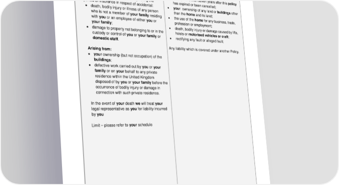 ADH 15.04a 5 6. Property Owners Liability We will pay you up to the limit for any one claim or series of claims arising from any one event or one source or original cause that you or your family become legally liable to pay as compensation (including costs and expenses agreed by us in writing) occurring during the period of insurance in respect of accidental: • death, bodily injury or illness of any person who is not a member of your family residing with you or an employee of either you or your family; • damage to property not belonging to or in the custody or control of you or your family or domestic staff . Arising from: • your ownership (but not occupation) of the buildings ; • defective work carried out by you or your family or on your behalf to any private residence within the United Kingdom disposed of by you or your family before the occurrence of bodily injury or damage in connection with such private residence. In the event of your death we will treat your legal representative as you for liability incurred by you Limit – please refer to your schedule Your legal liability to pay compensation arising directly or indirectly from: • an agreement which imposes a liability on you which you would not be under in the absence of such agreement; • arising more than seven years after this policy has expired or been cancelled; • your ownership of any land or buildings other than the home and its land; • the use of the home for any business, trade, profession or employment; • death, bodily injury or damage caused by lifts, hoists or motorised vehicles or craft ; • rectifying any fault or alleged fault; Any liability which is covered under another Policy.