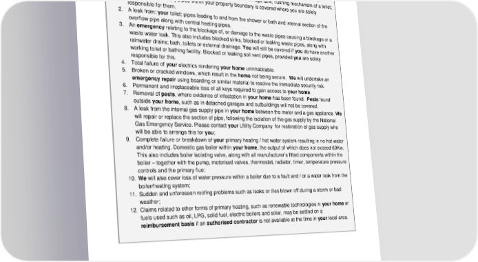 ADH 15.04a 41 What is covered: Emergency incidents that are covered by this policy are: 1. Plumbing problems related to the internal hot and cold water pipes between the main internal stopcock and the internal taps including the cold water storage tank; flushing mechanism of a toilet; External water supply pipes within your property boundary is covered where you are solely responsible for them. 2. A leak from: your toilet; pipes leading to and from the shower or bath and internal section of the overflow pipe along with central heating pipes. 3. An emergency relating to the blockage of, or damage to the waste pipes causing a block age or a waste water leak. This also includes blocked sinks, blocked or leaking waste pipes, along with rainwater drains; bath, toilets or external drainage. You will still be covered if you do have another working toilet or bathing facility. Blocked or le aking soil vent pipes, provided you are solely responsible for this. 4. Total failure of your electrics rendering your home uninhabitable. 5. Broken or cracked windows, which result in the home not being secure. We w ill undertake an emergency repair using boarding or similar material to resolve the immediate security risk. 6. Permanent and irreplaceable loss of all keys required to gain access to your home . 7. Removal of pests , where evidence of infestation in your home has been found. Pests found outside your home , such as in detached garages and outbuildings will not be covered. 8. A leak from the internal gas supply pipe in your home between the meter and a gas appliance. We will repair or replace the section of pipe, following the isolation of the gas supply by the National Gas Emergency Service. Please contact your Utility Company for restoration of gas supply who will be able to arrange this for you; 9. Complete failure or breakdown of your primary heating / hot water system resulting in no hot water and/or heating. Domestic gas boiler within your home , the output of which does not exceed 60Kw. This also includes boiler isolating valve, along with all manufacturer’s fitted components within the boiler – together with the pump, motorised valves, thermostat, radiator, timer, temperature pressure controls and the primary flue; 10. We will also cover loss of water pressure within a boiler due to a fault and / or a water leak from the boiler/heating system; 11. Sudden and unforeseen roofing problems such as leaks or tiles blown off during a storm or bad weather; 12. Claims related to other forms of primary heating, such as renewable technologies in your home or fuels used such as oil, LPG, soli d fuel, electric boilers and solar, may be settled on a reimbursement basis if an authorised contractor is not available at the time in your local area.