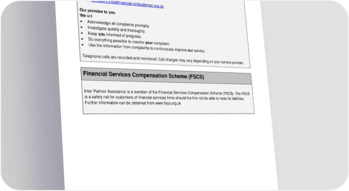 ADH 15.04a 45 The Financial Ombudsman Service Exchange Tower Harbour Exchange Square London E14 9SR Tel: 0300 123 9123 or 0800 023 4567 Fax: 020 7964 1001 Email: complaint.info@financial -ombudsman.org.uk Our promise to you We will • Acknowledge all complaints promptly. • Investigate quickly and thoroughly. • Keep you informed of progress. • Do everything possible to resolve your complaint. • Use the information from complai nts to continuously improve our service. Telephone calls are recorded and monitored. Call charges may vary depending on your service provider. Financial Services Compensation Scheme (FSCS) Inter Partner Assistance is a member of the Financial Services Compensation Scheme (FSCS). The FSCS is a safety net for customers of financial services firms should the firm not be able to meet its liabilities. Further information can be obtained from www. fscs.org.uk