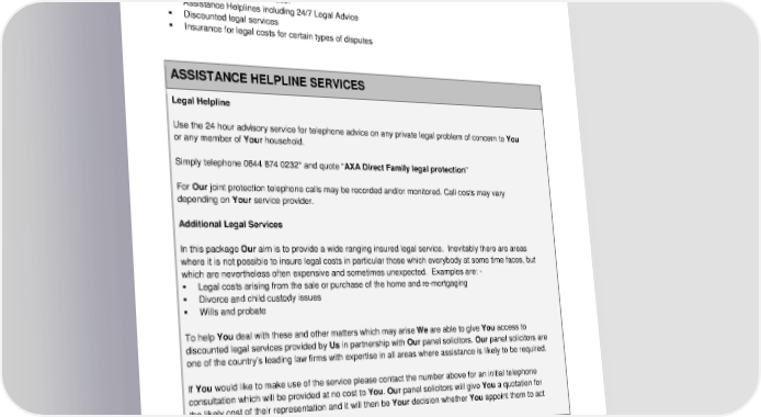 ADH 15.04a 46 Family Legal Protection (optional extra) Your p olicy schedule will show if this section is in force. Family Legal Protection provides: - Assistance Helplines including 24/7 Legal Advice Discounted legal services Insurance for legal costs for certain types of disputes ASSISTANCE HELPLINE SERVICES Legal Helpline Use the 24 hour advisory service for telephone advice on any private legal problem of concern to You or any member of Your household. Simply telephone 0844 874 0232* and quote “ AXA Direct Family legal protection ” For Our joint protection telephone calls may be recorded and/or monitored. Call costs may vary depending on Your service provider. Additional Legal Services In this package Our aim is to provide a wide ranging insured legal service. Inevitably there are areas where it is not possible to insure legal costs in particular those which everybody at some time faces, but which are nevertheless often expensive and sometimes unexpected. Examples are: - Legal costs arising from the sale or purchase of the home and re- mortgaging Divorce and child custody issues Wills and probate To help You deal with these and other matters which may arise We are able to give You access to discounted legal services provided by Us in partnership with Our panel solicitors. Our panel solicitors are one of the country’s leading law firms with expertise in all areas where assistance is likely to be required. If You would like to make use of the service please contact the number above for an initial telephone consultation which will be provided at no cost to You . Our panel solicitors will give You a quotation for the likely cost of their representation and it will then be Your decision whether You appoint them to act for You .