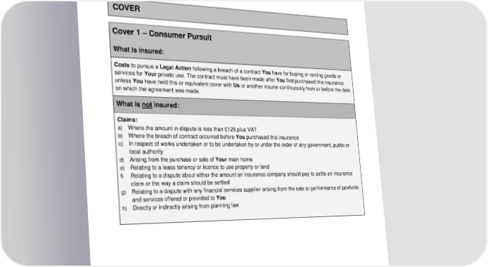 ADH 15.04a 49 You/Your/Yourself Any person named in the schedule whose permanent residence is within th e United Kingdom, the Channel Islands or the Isle of Man and all other persons permanently living within the home other than rent paying guests but including Your children attending university or college whose main residence is the home. If You die Your personal representatives will be covered to pursue or defend cases covered by this insurance on Your behalf that arose prior to Your death. COVER Cover 1 – Consumer Pursuit What is insured: Costs to pursue a Legal Action following a breach of a contract You have for buying or renting goods or services for Your private use. The contract must have been made after You first purchased this insurance unless You have held this or equivalent cover with Us or another insurer continuously from or before the date on which the agreement was made. What is not insured: Claims: a) Where the amount in dispute is less than £125 plus VAT b) Where the breach of contract occurred before You purchased this insurance c) In respect of works undertaken or to be undertaken by or under the order of any government, public or local authority d) Arising from the purchase or sale of Your main home e) Relating to a lease tenancy or licence to use property or land f) Relating to a dispute about either the amount an insurance company should pay to settle an insurance claim or the way a claim should be settled g) Relating to a dispute with any financial services supplier arising from the sale or performance of products and services offered or pr ovided to You h) Directly or indirectly arising from planning law