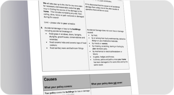 ADH 15.04a 6 Accidental Damage (optional extra) Your policy schedule will show if you have chosen this section. 7. Accidental damage to cables, drain inspection covers and underground drains, pipes or tanks providing services to or from the home and for which you are responsible. We will also pay up to the limit for any one claim for necessary and reasonable costs that you incur in finding the source of the damage to the home . This includes reinstating any wall, floor, ceiling, drive, fence or path removed or damaged during the search Limit – please refer to your schedule 8. Accidental damage or loss to the buildings including accidental breakage of: • fixed glass in windows, doors, fanlights, skylights, greenhouses, conservatories and verandas; • fixed ceramic hobs and ceramic tops of fixed cookers; • fixed sanitary ware and bathroom fittings Loss or damage to pitch fibre drains caused by inherent defects in the design, material, construction, or installation of the pipes and drains. If it is discovered that the cause is not accidental damage then unless one of the other causes is operative there will be no cover. Accidental Damage does not cover loss or damage caused: • by frost; • by or arising from faulty workmanship, defective design or use of defective materials; • by insects or vermin ; • by chewing, scratching, tearing or fouling by your domestic pets; • by mechanical or electrical breakdown or failure; • to gates, hedges and fences; • to drives, patios and paths unless your home has been damaged at the same time and by the same cause. Causes What your policy covers: What your policy does not cover: Your policy covers the buildings for loss or damage resulting from any of the following: 1. Storm or flood Loss or damage: • to gates, hedges and fences; • to drives, patios and paths unless your home has been damaged at the same time and by the same cause; • by storm to radio or television aerials or satellite dishes.