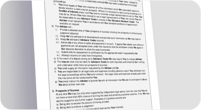 ADH 15.04a 55 Conditions : 1. Claims a) You must notify claims as soon as reasonably possible once You become aware of the incident and within no more than 180 days of You becoming aware of the incident. There will be no cover under this policy if, as a result of a delay in reporting the claim, Ou r position has been prejudiced. We m ay investigate the claim and take over and conduct the legal proceedings in Your name. Subject to Your consent which shall not be unreasonably withheld We may reach a settlement of the legal proceedings. i.) You must suppl y at Your own expense all of the information which We reasonably require to decide whether a claim may be accepted. Where it is necessary to start court proceedings or a Conflict of Interest arises, and You wish to nominate a legal representative to act f or You , You may do so. W here You have elected to use a legal representative of Your own choice You will be responsible for any Advisers’ Costs in excess of Our Standard Advisers’ Costs . The Adviser must represent You in accordance with Our standard condit ions of appointment available on request. b) The Adviser will: - i.) Provide a detailed view of Your prospects of success including the prospects of enforcing any judgment obtained. ii.) Keep Us fully advised of all developments and provide such information as We may require. iii.) Keep Us advised of Advisers’ Costs incurred. iv.) Advise Us of any offers to settle and payments in to court. If against Our advice such offers or payments are not accepted cover under this insurance shall be withdrawn unless We agree in Our abso lute discretion to allow the case to proceed. v.) Submit bills for assessment or certification by the appropriate body if requested by Us. vi.) Attempt recovery of costs from third parties. c) In the event of a dispute arising as to Advisers’ Costs We may require You to change Adviser. d) The Insurer shall only be liable for Advisers’ Costs for work expressly authorised by Us in writing and undertaken while there are prospects of success. e) You shall supply all information requested by the Adviser and Us. f) You are responsibl e for all legal costs and expenses including adverse costs if You withdraw from the legal proceedings without Our prior consent. Any legal costs and expenses already paid under this insurance will be reimbursed by You . g) You must instruct the Adviser to pro vide Us with all information that We ask for and report to Us as We direct at their own cost. 2. Prospects of Success At any time We may, but only when supported by independent legal advice, form the view that You do not have a more than 50% chance of winning the case and achieving a positive outcome. If so, We m ay decline support or any further support. Examples of a positive outcome are: a) Being able to recover the amount of money at stake b) Being able to enforce a judgement c) Being able to achieve an outcome which best serves Your interests 3. Other insurances If any claim covered under this policy is also covered by another legal expenses policy, or would have been covered if this policy did not exist, We will only pay Our share of the claim even if the other insurer refuses the claim.