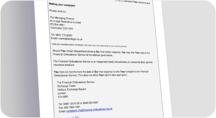 ADH 15.04a 57 MAKING A COMPLAINT We aim to provide the highest standard of service to every customer. If Our service does not meet Your expectations, We want to hear about it so We can try to put things right All complaints We receive are taken seriously. The following will help Us to understand Your concerns and give You a fair response. Making your complaint Please write to: The Managing Director Arc Legal Assistance Limited PO Box 8921 Colchester CO4 5YD Tel: 0844 770 9000 * Email: claims@arclegal.co.uk *Calls are recorded and/or monitored. Call costs may vary depending on your service provider . Should You remain dissatisfied following Our final written response, You may refer Your case to the Financial Ombudsman Service at the address given below. The F inancial Ombudsman Service is an independent body that arbitrates on complaints about general insurance products. You have six months from the date of Our final response to refer Your complaint to the Financial Ombudsman Service . This does not affect Your right to take legal action. The Financial Ombudsman Service Exchange Tower Harbour Exchange Square London E14 9SR Tel: 0300 123 9123 or 0800 023 4567 Fax: 020 7964 1001 Email: complaint.info@financial -ombudsman.org.uk Our promise to You We will • Acknowledge all complaints promptly. • Investigate quickly and thoroughly. • Keep You informed of progress. • Do everything possible to resolve Your complaint. • Use the information from complaints to continuously improve Our service.